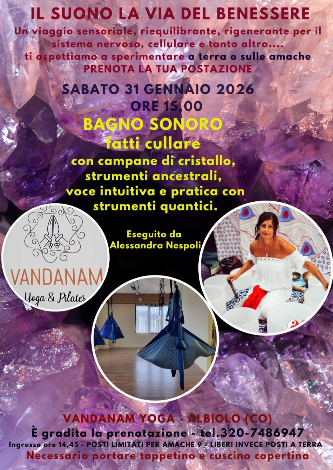 Regalati un momento di puro benessere con il nostro appuntamento mensile dedicato al rilassamento profondo e al riequilibrio energetico. Le campane di cristallo ti guideranno in un viaggio sensoriale unico, che aiuterà a ridurre lo stress, migliorare la concentrazione e portare serenità sia al corpo che alla mente.